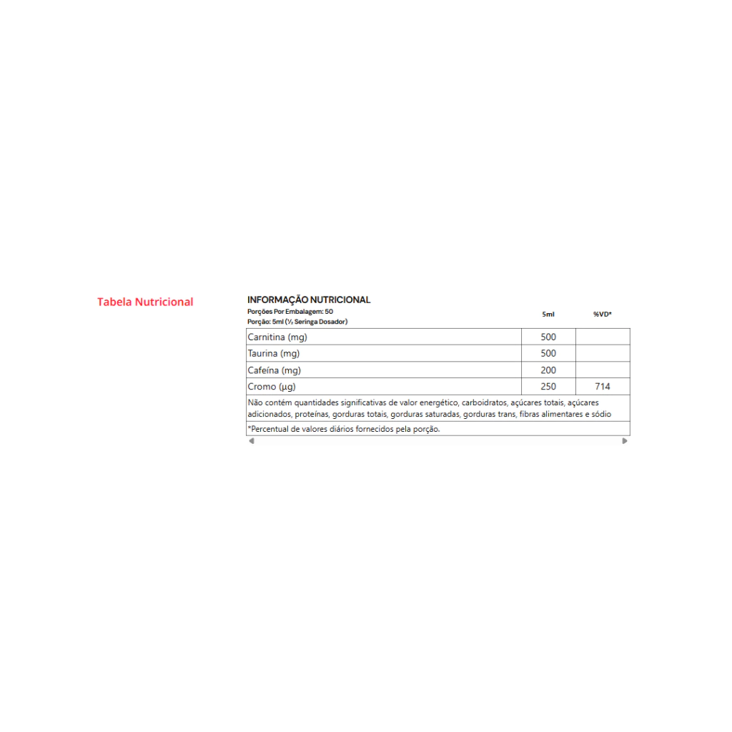 Água purificada, tartarato de L-carnitina, taurina, cafeína, picolinato de cromo, especiarias aromatizantes pimenta cayena, pimenta preta, gengibre em pó, conservante benzoato de sódio e sorbato de potássio, estabilizante goma xantana, aromatizante idêntico ao natural, edulcorante sucralose, corante amarelo tartrazina e azul brilhante. NÃO CONTÉM GLÚTEN.