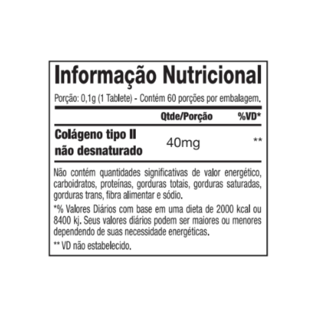 Fornece 40 mg de Colágeno tipo II não desnaturado por tablete.