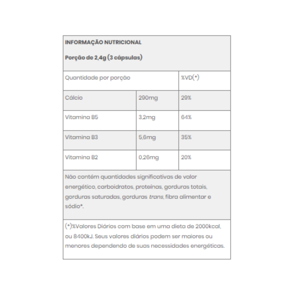 Beta-5 (Vitamina B5 ácido pantotênico), NO2-Drive [Vitamina B3 Nicotinamida, Vitamina B2 Riboflavina e L-Ascorbato de Cálcio]. NÃO CONTÉM GLÚTEN.