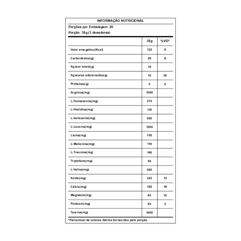 Suplemento intra-treino composto por um blend de carboidratos. Composto por eletrólitos, EAAs, arginina e taurina.