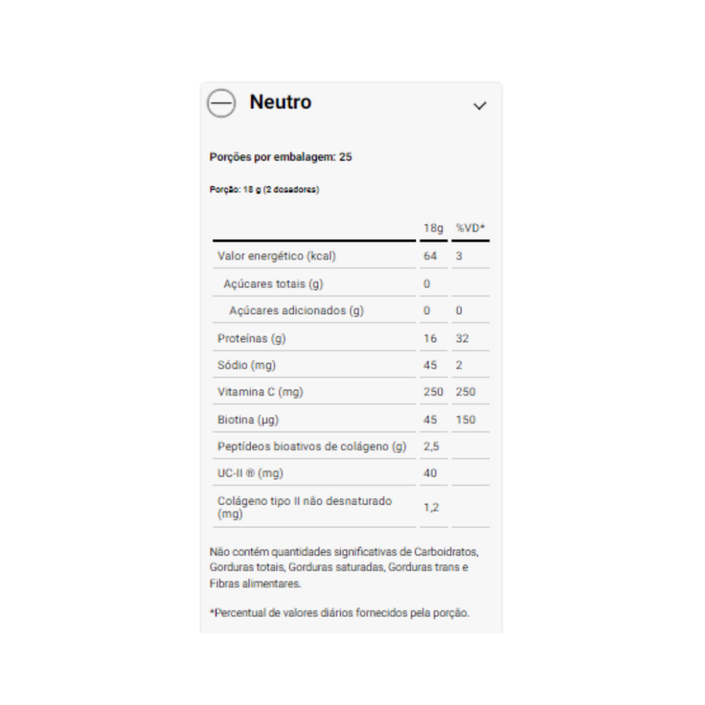 Colágeno hidrolisado, peptídeos bioativos de colágeno hidrolisado com peso molecular médio de 2kDa, mix de vitaminas (colágeno hidrolisado, ácido ascórbico (vitamina C) e D-biotina), colágeno de frango com colágeno tipo II não desnaturado e aromatizante.
