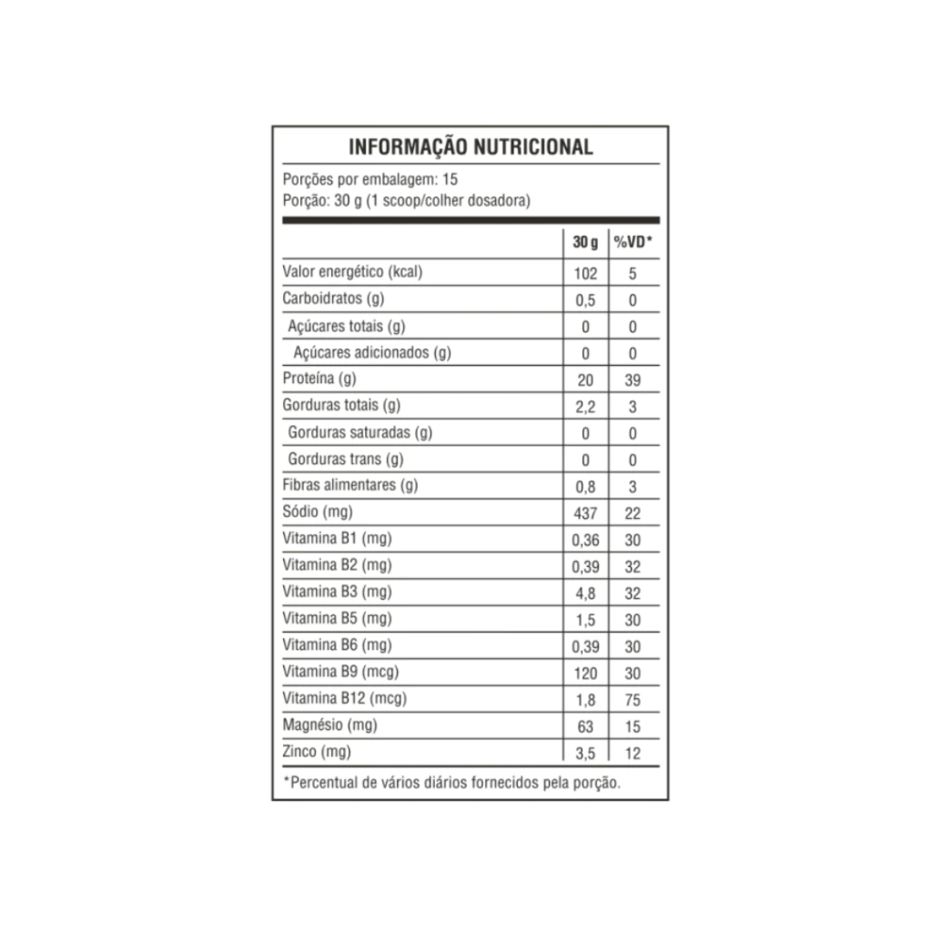 Proteína de ervilha, farinha de amêndoa, bisglicinato de magnésio, bisglicinato de zinco, complexo B, stévia e aromas naturais.