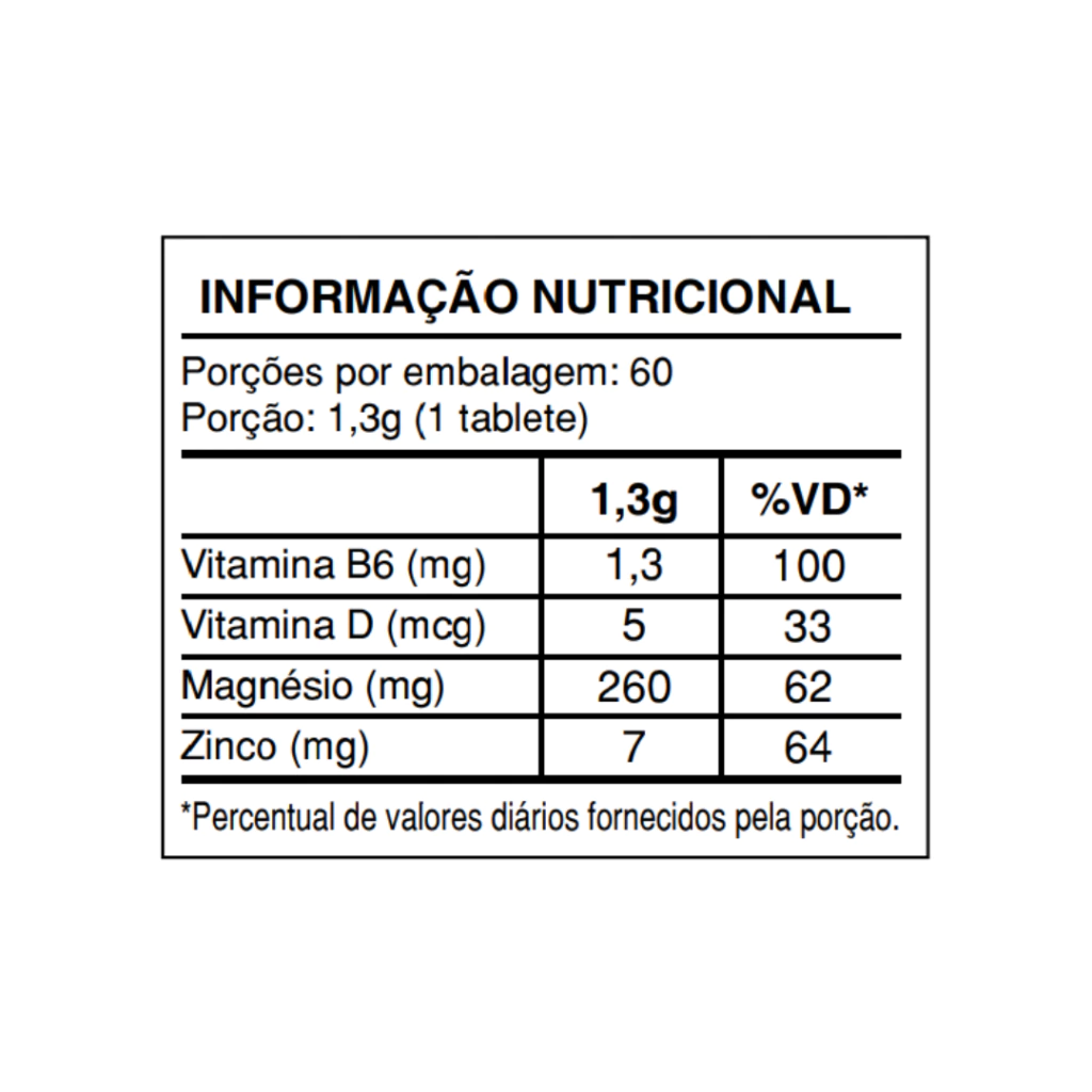 Bisglicinato de magnésio (magnésio), bisglicinato de zinco (zinco), cloridrato de piridoxina (vitamina B6), colecalciferol (vitamina D3) e excipiente q.s.p. agente de massa celulose microcristalina, antiumectantes talco e dióxido de sílicio.
